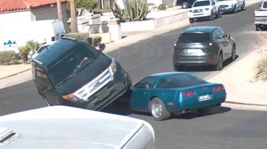 Ο δρόμος είναι τελείως άδειος. Δύο μόλις οχήματα κινούνται στη γειτονιά του Glendale στην Καλιφόρνια των ΗΠΑ, κι αυτά με την ελάχιστη ταχύτητα. Με κάποιο μαγικό τρόπο όμως, κατάφεραν να τρακάρουν. Ο οδηγός του Ford Explorer, προφανώς δεν είδε ποτέ την Corvette και πέρασε πάνω από το κλασικό sportcar.
