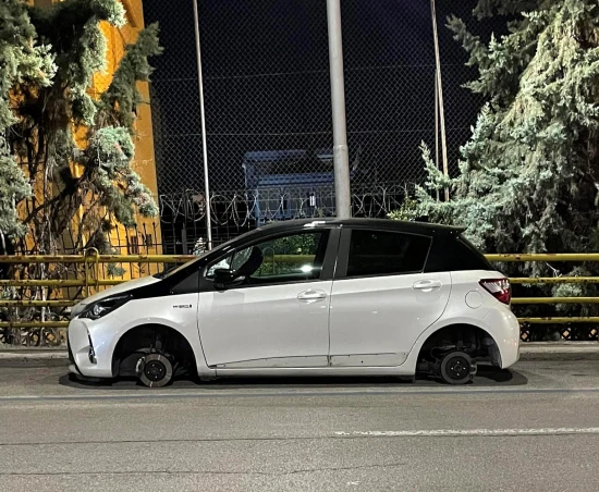 Οι δράστες αφαίρεσαν τα ελαστικά και τις ζάντες, με το Yaris να στέκεται στο οδόστρωμα χωρίς καν τάκους, προκαλώντας περαιτέρω ζημιά στο αυτοκίνητο.