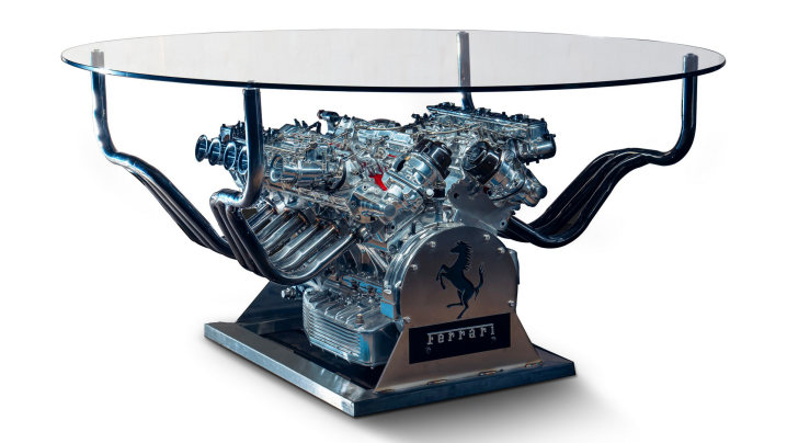 Πρόκειται για ένα εντυπωσιακό τραπέζι που έχει ως βάση έναν αυθεντικό V12 κινητήρα. Είναι ένα από τα θρυλικά 12κύλινδρα μοτέρ που εφοδίαζαν τα ονειρικά μοντέλα της γκάμας της. Φυσικά, ο κινητήρας με τα έξι διπλά καρμπυρατέρ Weber έχει τροποποιηθεί ειδικά ώστε να στέκεται κάτω από το γυαλί.