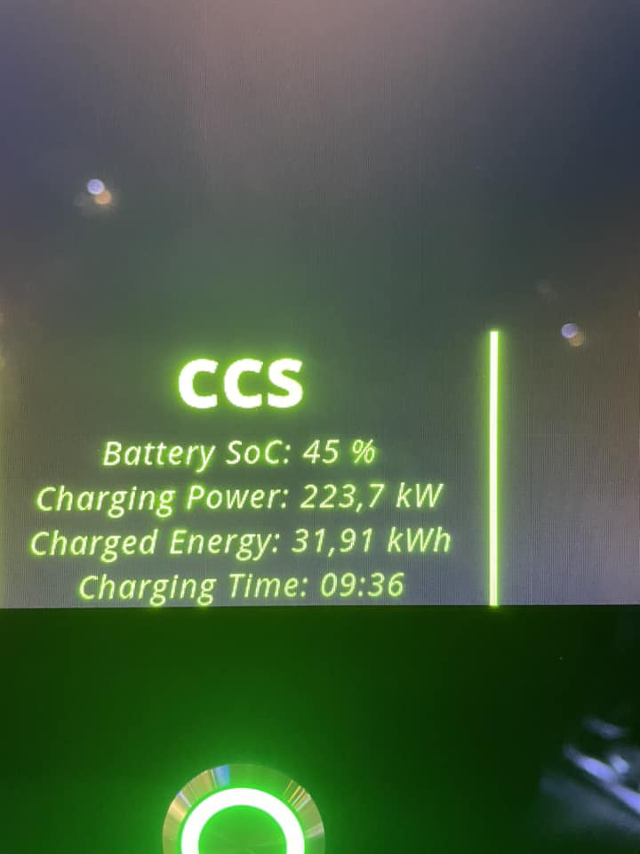 Η ταχύτητα του φορτιστή είναι τόσο μεγάλη ώστε ακόμα και ένα αυτοκίνητο με μεγάλη μπαταρία μπορεί να τη γεμίσει σε πολύ λίγο χρόνο. Στις εικόνες βλέπουμε ένα Kia EV6 Long Range 2WD με τη μεγάλη μπαταρία των 77,4 KWh. Στην αρχή της φόρτισης το ποσοστό είναι 4%. Μόλις 20 λεπτά αργότερα, το ποσοστό έχει ανέβει στο 80%, με την ισχύ κάποια στιγμή να αγγίζει ακόμα και τα 223,7 KW.