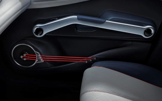 Καθώς περιεργαζόμασταν το αυτοκίνητο, είδαμε στo κάτω τμήμα της πόρτας τρία κόκκινα σχοινιά. Μας τράβηξαν την προσοχή, τα περιεργαστήκαμε με το δάχτυλο και τότε μας περίμενε μια έκπληξη. Συνειδητοποιήσαμε ότι ήταν χορδές, καθώς το καθένα έβγαζε διαφορετικό ήχο-νότα.