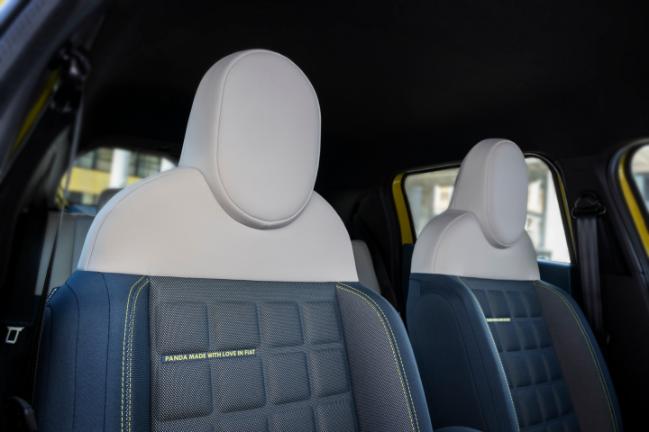 Οι επιφάνειες καλύπτονται από υφάσματα σε μοντέρνα χρώματα, στο ταμπλό υπάρχει ξύλο από ίνες μπαμπού, με τα καθίσματα, τα οποία έχουν ενσωματωμένα προσκέφαλα εμπρός να φέρουν μια κίτρινη επιγραφή που αναφέρει: «PANDA MADE WITH LOVE IN FIAT».
