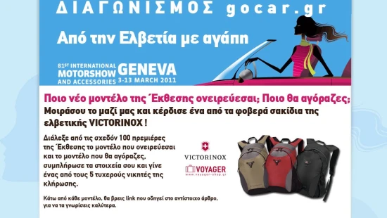 Το gocar.gr, με αφορμή τη διεθνή έκθεση αυτοκινήτου που γίνεται αυτές τις ημέρες στην Ελβετία, και πιο συγκεκριμένα στη Γενεύη, σου προσφέρει τη δυνατότητα να κερδίσεις μοναδικά... ελβετικά δώρα! Από τις 3 έως και τις 13 Μαρτίου, μπορείς να συμμετέχεις στο διαγωνισμό που διοργανώνει το gocar.gr σε συνεργασία με την εταιρεία Voyager και να αποκτήσεις ένα από τα δώρα της γνωστής φίρμας, για τα εξαιρετικά της προϊόντα , Victorinox.
