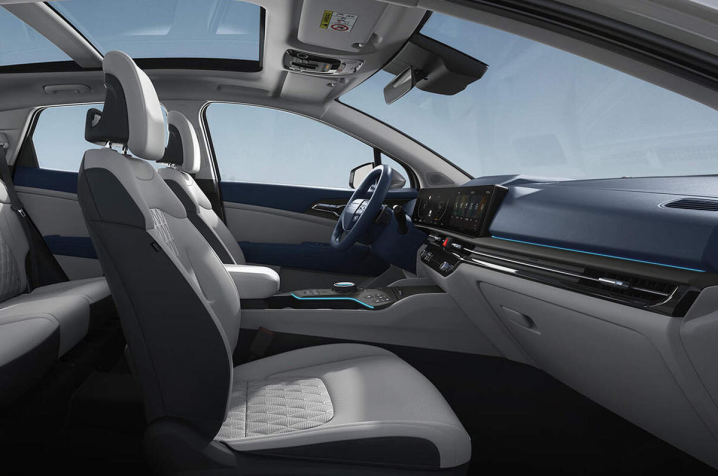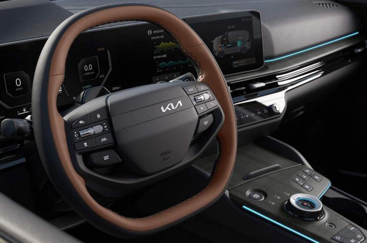Στη καμπίνα, παρατηρούμε πως και εδώ υπάρχουν κοινά στοιχεία με τη σειρά EV της Kia. Τις εντυπώσεις και τα βλέμματα κλέβει η νέα κυρτή οθόνη αφής σε διάσταση 12,3’’, η οποία εφοδιάζεται με τη νεότερη γενιά του συστήματος πολυμέσων της κορεάτικης φίρμας. Συνδέεται κάτω από μία ενιαία γυάλινη επιφάνεια με τον ψηφιακό πίνακα οργάνων, δημιουργώντας μία καλαίσθητη και φουτουριστική εικόνα. Νέα σχεδίαση έχει το τιμόνι με τις δύο ακτίνες, ενώ μία μπάρα φωτισμού LED στη κεντρική κονσόλα συμβάλλει στη δημιουργία ενός ατμοσφαιρικού περιβάλλοντος. Επιπλέον, στην κατασκευή της καμπίνας έχει γίνει χρήση νέων υλικών, τα οποία με τη σειρά τους συμβάλλον στην περαιτέρω βελτίωση της ηχομόνωσης και στο ακόμα πιο χαμηλό επίπεδο θορύβου.