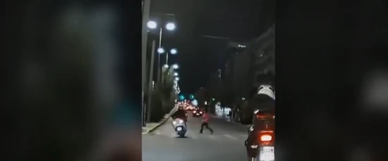 Ο οδηγός του σκούτερ φεύγει από το φανάρι παρασύροντας τη γυναίκα που τρέχει στη διάβαση πεζών. Και οι δύο πέφτουν στο έδαφος, με τον αστυνομικό να τρέχει κοντά τους.