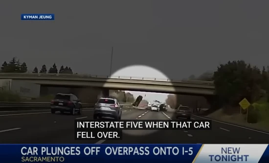 Ο οδηγός έχασε τον έλεγχο και το αυτοκίνητο έπεσε από τη γέφυρα στη μέση του αυτοκινητόδρομου. Ως εκ θαύματος δεν καταπλάκωσε άλλο όχημα.