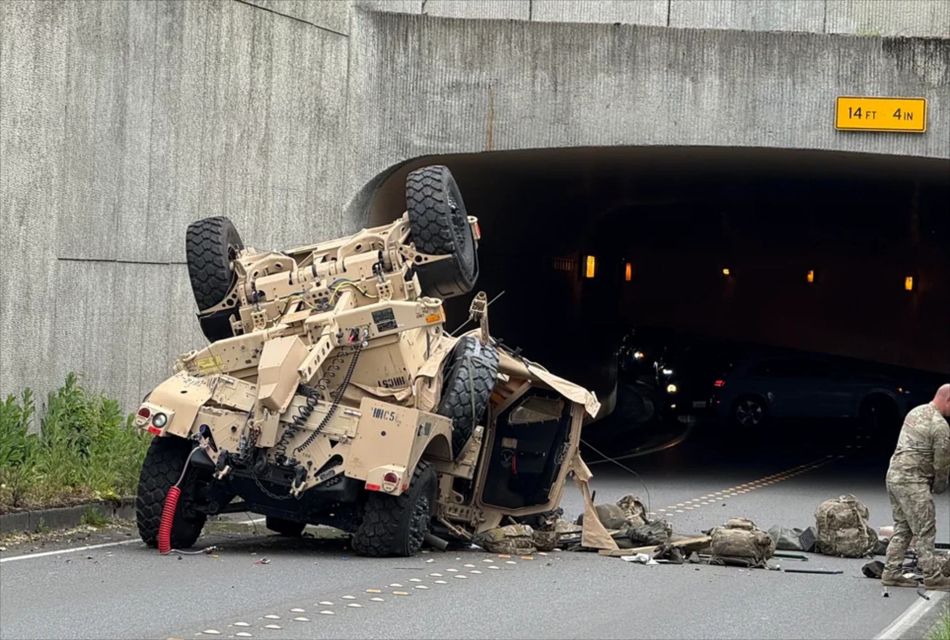 Το απίστευτο ατύχημα σημειώθηκε στο Σιάτλ των ΗΠΑ, όταν ο οδηγός του στρατιωτικού οχήματος έχασε τον έλεγχο ενώ κινούνταν στον Αυτοκινητόδρομο 90. Το όχημα έσπασε τα προστατευτικά και έφυγε στο κενό πέφτοντας στον ακριβώς από κάτω δρόμο, στην έξοδο της σήραγγας.