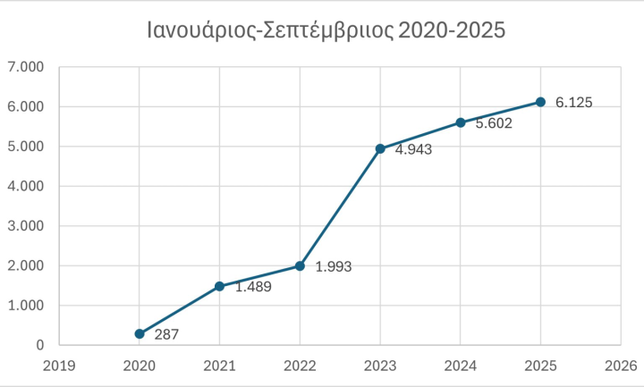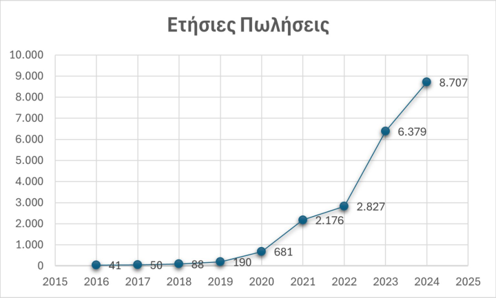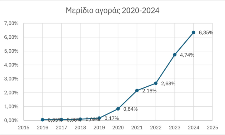 Αν υπάρχει μία βεβαιότητα, είναι ότι η αγορά των ηλεκτρικών αυτοκινήτων στην Ελλάδα συνδέεται άμεσα με τις κρατικές επιδοτήσεις, κυρίως μέσω των προγραμμάτων Κινούμαι Ηλεκτρικά. Όταν υπάρχουν διαθέσιμα κεφάλαια, οι πωλήσεις ανεβαίνουν γρήγορα. Όταν εξαντλούνται τα κεφάλαια, ο ρυθμός ανόδου μειώνεται σημαντικά. Αυτό ακριβώς φαίνεται στο γράφημα που ακολουθεί. Το 2020 και το 2021 είχαμε την πρώτη έντονη αύξηση των πωλήσεων, χάρη στο Κινούμαι Ηλεκτρικά 1. Το 2022 η άνοδος ήταν πιο ήπια επειδή το Κινούμαι Ηλεκτρικά 2 άνοιξε από τα μισά της χρονιάς και μετά. Το 2023 με την επιδότηση των 9.000 ευρώ του Κινούμαι Ηλεκτρικά 3 οι ταξινομήσεις εκτοξεύτηκαν, ενώ το 2024 η αύξηση ήταν μικρότερη, λόγω των προβλημάτων που παρουσιάστηκαν στο πρόγραμμα.