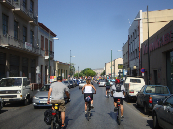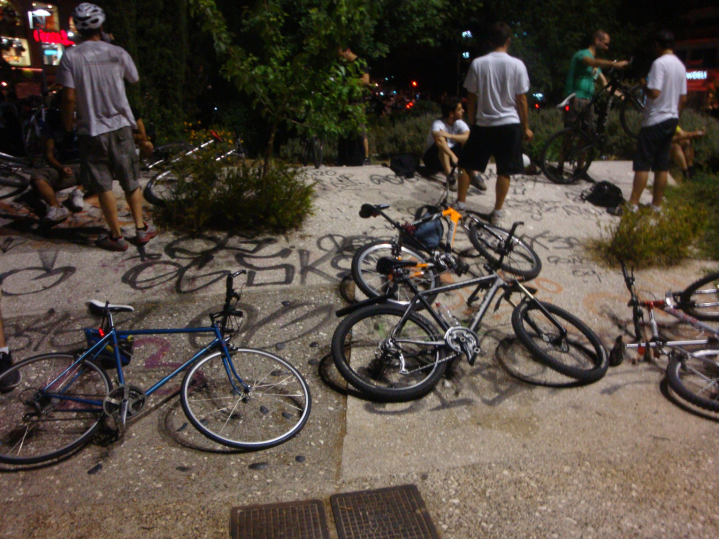 Τα μεσάνυχτα, 12 και κάτι, φτάσαμε πλατεία Γλυφάδας. Πάλι καλά που υπάρχουν αρκετά περίπτερα και μπόρεσαν όλοι να ανεφοδιαστούν. Κάθησα σε ένα παγκάκι και ο κύριος που καθόταν ήδη διαβάζοντας ένα βιβλίο, με ρώτησε: "τι διαδήλωση είναι αυτή; Δεν την ξέρω". "Freeday κάθε Παρασκευή βράδυ και σήμερα είναι το Tour D' Atene", του εξήγησα και σύντομα η αντίδραση ήταν “μπράβο παιδιά”. Το 20λεπτο διάλειμμα τελείωσε και ξεκινήσαμε για τον επόμενο προορισμό, την πλατεία Ελευθερίας στον Κορυδαλλό. Περίπου 25 km, όπου τα περισσότερα είναι παραλιακά. Περάσαμε δίπλα από το Ελληνικό, το Σ.Ε.Φ., το λιμάνι του Πειραιά, την ιχθυόσκαλα του Κερατσινίου και ύστερα… Ύστερα άρχισε η ανηφόρα, μάλλον για να μας προετοιμάσει για το μετά. Η διαδρομή ήταν πολύ διαφορετική από τις συνηθισμένες. Έβλεπες πολύ θάλασσα και λίγες πολυκατοικίες. Στην πλατεία Ελευθερίας φτάσαμε περίπου στις 2 και κάτι. Μια μικρή εξάντληση είχε αρχίσει να εμφανίζεται, αφού λίγο η ζέστη, λίγο η πείνα (5 ώρες πριν το τελευταίο γεύμα), έκαναν το μαρμάρινο σκαλοπάτι μπροστά μου να φαίνεται σαν πολυθρόνα. Δεν το έβαλα κάτω όμως. Στόχος η επιστροφή στο Θησείο μέσω Θρακομακεδόνων και Αγίας Παρασκευής.