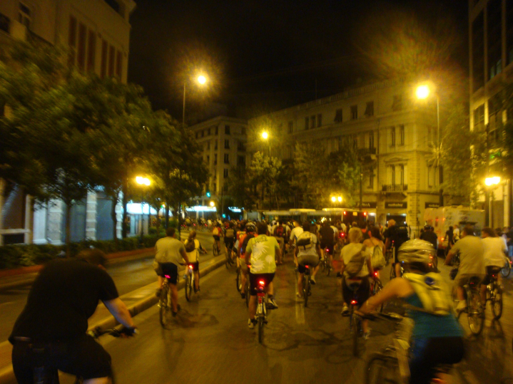 Όπως κάθε φορά, έτσι και την Παρασκευή 22 Ιουλίου η πλατεία ήταν γεμάτη με ποδηλάτες. Ανάμεσά τους και η αφεντιά μου, παρέα με το δίτροχο σύντροφό μου. “Ο ψηλός με το σπαστό”, όπως με φωνάζουν τα παιδιά στο gocar. Στις 10 ακριβώς ξεκινήσαμε για τη μεγάλη νύχτα, με πρώτο προορισμός την πλατεία Γλυφάδας. Πρώτα τα εύκολα δηλαδή, καθώς η διαδρομή είναι κυρίως κατηφορική και οι δρόμοι αρκετά φαρδιοί για να χωρέσουν τα περίπου 2.500 με 3.000 ποδήλατα που ξεκινήσαμε. Οποιαδήποτε άλλη μέρα και ώρα, απλά δεν θα μπορούσες να περάσεις από τις Βουλιαγμένης και Ποσειδώνος. Το βράδυ εκείνο όμως μπορούσες να απολάυσεις τους δόμους χωρίς καυσαέριο και θόρυβο. Διόρθωση: θόρυβος υπήρχε, αλλά ευχάριστος, ειδικά κάτω από τις γέφυρες όπου οι φωνές, τα κουδουνίσματα και οι κόρνες έσπαγαν την ησυχία της νύχτας.