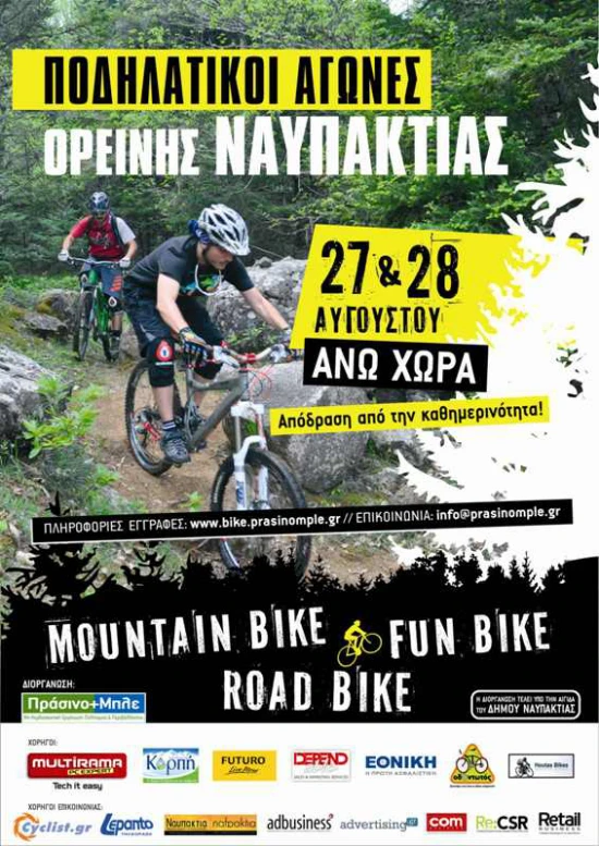 Ποδηλατικούς Αγώνες διοργανώνει στις 27 - 28 Αυγούστου 2011 η Μη Κερδοσκοπική Οργάνωση Πολιτισμού και Περιβάλλοντος “Πράσινο+Μπλε” στην Άνω Χώρα Ορεινής Ναυπακτίας, σε μία προσπάθεια ανάδειξης της φυσικής ομορφιάς της περιοχής. Το πρόγραμμα περιλαμβάνει αγώνες σε χώμα και άσφαλτο, με τους νικητές να κερδίζουν δώρα όπως διήμερα ταξίδια αναψυχής και αξεσουάρ ποδηλάτου. Μετά τους αγώνες, ακολουθεί αντάμωμα στη κεντρική πλατεία Άνω Χώρας. Η διανυκτεύρευση των συμμετεχόντων κοστίζει 20 ευρώ (συμπεριλαμβάνεται πρωινό), ενώ διατίθενται και ποδήλατα δωρεάν για συμμετοχή. Δείτε περισσότερες πληροφορίες και δηλώστε συμμετοχή στο επίσημο site.