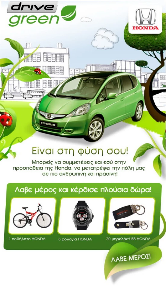 Ένα διαγωνισμό στο facebook με τίτλο “Drive Green” πραγματοποιεί η ελληνική αντιπροσωπεία της Honda. Οι φίλοι της Honda, μέσα από τη σελίδα της εταιρείας (www.facebook.com/honda.greece), προσκαλούν όσο το δυνατόν περισσότερους φίλους τους με στόχο να μετατρέψουν τη “μουντή και γκρίζα” εικόνα της πόλης που ζουν σε μία πιο πράσινη και φιλική. Με αυτό τον τρόπο η Honda θέλει να προβάλλει τα green μοντέλα της, όπως τα υβριδικά Jazz Hybrid, Insight, CRZ και Civic Hybrid ή το FCX Clarity με κυψέλες υδρογόνου. Οι συμμετέχοντας στο διαγωνισμό “Drive Green”, ανάλογα με τον αριθμό των φίλων που θα προσκαλέσουν, συμμετέχουν ταυτόχρονα σε κλήρωση με δώρα:
