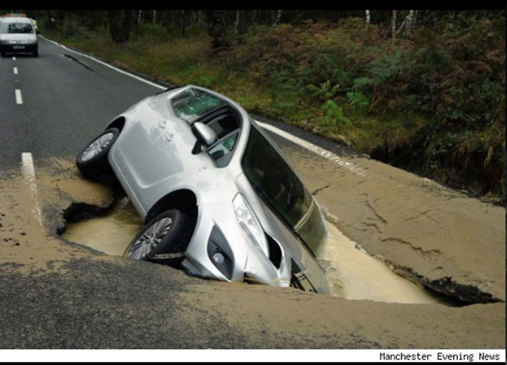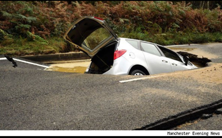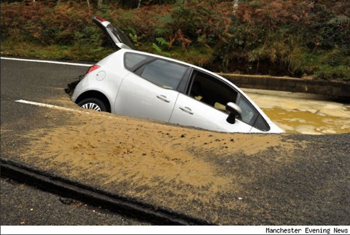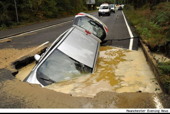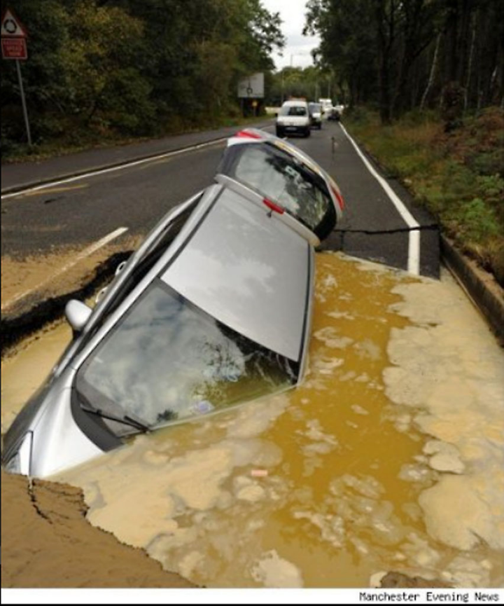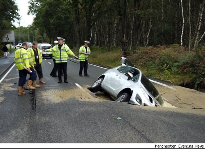 Τη λάθος ώρα στη λάθος στιγμή βρέθηκε ο οδηγός του συγκεκριμένου MPV. Ο ατυχής οδηγός ενώ κινούνταν ανέμελος με το φως της ημέρας στο δρόμο που ενώνει τις επαρχιακές πόλεις Woking και Chertsey της Αγγλίας, τον κατάπιε… στην κυριολεξία ο δρόμος. Οι λάσπες πλημμύρισαν σε χρόνο dt το εσωτερικό του αυτοκινήτου, με τον οδηγό να βρίσκει δίοδο διαφυγής από την πίσω πόρτα του πορτμπαγκάζ. Οι φωτογραφίες που προέρχονται από την εφημερίδα Manchester Evening News αποκαλύπτουν το περίεργο γεγονός.