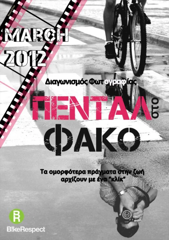 Θέμα το ποδήλατο έχει ο διαγωνισμός φωτογραφίας που διοργανώνει το BikeRespect και ο οποίος διαρκεί από 08/01/12 έως 10/03/12. Η διαδικασία είναι απλή: συγκεντρώνεις τις καλύτερες φωτογραφίες σου με θέμα το ποδήλατο και τις ανεβάζεις στο wall της σελίδας "Πεντάλ στο Φακό", στο facebook. Στη συνέχεια, το προωθείς στους φίλους σου για να ξεχωρίσουν τις καλύτερες, κάνοντας "Like" ο καθένας σε αυτήν/ες που του αρέσουν. Οι 30 επικρατέστερες φωτογραφίες θα αναδειχθούν στην έκθεση φωτογραφίας που διοργανώνει το BikeRespect, τον Μάρτιο του 2012. Θυμήσου: σε όλες τις φωτογραφίες θα πρέπει να υπάρχει απαραίτητα λεζάντα-θέμα. Οι φωτογραφίες μπορούν να είναι έγχρωμες ή ασπρόμαυρες, ενώ επιτρέπεται η επεξεργασία και το ρετουσάρισμά τους. Τέλος, λαμβάνοντας μέρος στον διαγωνισμό οι συμμετέχοντες εγγυώνται ότι είναι οι ίδιοι οι δημιουργοί και κάτοχοι των φωτογραφιών που δημιουργήθηκαν.