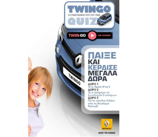 H Renault σας δίνει τη δυνατότητα να γνωρίζετε το νέο Twingo μέσα από ένα διασκεδαστικό κουίζ στο Facebook και να κερδίσετε πλούσια δώρα. Απλά, κάντε Like στη σελίδα της Renault Greece και απαντήστε στις 5 απλές ερωτήσεις του κουίζ "TWIN-GO KAI ΚΕΡΔΙΣΕ". Καθεμία από τις 5 ερωτήσεις του κουίζ αναδεικνύει ένα από τα βασικά πλεονεκτήματα του νέου Twingo: πρωτότυπα χρώματα, δυνατότητα εξατομίκευσης, μηδενικά τέλη κυκλοφορίας για την diesel έκδοση, πολυμορφικότητα, 5ετής εγγύηση.