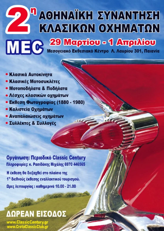 Έκθεση κλασικών αυτοκινήτων και μοτοσυκλετών, καλλιστεία και αναπαλαιώσεις οχημάτων, έκθεση φωτογραφίας 1880-1980 και άλλα, πολύ ενδιαφέροντα και γοητευτικά του κόσμου της Αυτοκίνησης περιλαμβάνει η 2η Αθηναϊκή Συνάντηση Κλασικών Οχημάτων που διεξάγεται από τις 29 Mαρτίου έως τις 1 Απριλίου 2012, στο Μεσογειακό Εκθεσιακό Κέντρο επί της λεωφόρου Λαυρίου 301 στην Παιανία.