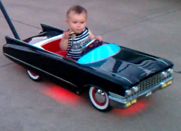 Ξέρουμε, κι εσύ θα ήθελες να είχες ένα τέτοιο ποδήλατο όταν ήσουν μικρός. ΟΚ, ίσως ο φωτισμός κάτω από το αυτοκίνητο και οι φλόγες από τις εξατμίσεις να μην είναι του γούστου σου -ούτε του δικού μας- αλλά η εικόνα του μπόμπιρα στην παιδική Cadillac του ’60 σε κάνει να ζηλεύεις, παραδέξου το. Αν πάντως θες να προσθέσεις ένα τέτοιο όχημα στο γκαράζ σου, ή του γιού σου, ψάξε στο eBay και θα βρεις από Ford roadster του ’32 μέχρι το κλασικό VW Bus. Να ξέρεις όμως ότι οι τιμές ξεκινάνε από 200 αμερικάνικα δολάρια για το καπάκι, το οποίο θα πρέπει να βάψεις και να προσαρμόσεις σε κάποιο παιδικό ποδήλατο, μόνος σου. Δες περισσότερα εδώ, αφού πρώτα “χαζέψεις” το παρακάτω video με τον τυπά-μπόμπιρα στην αποστράπτουσα Caddy του.