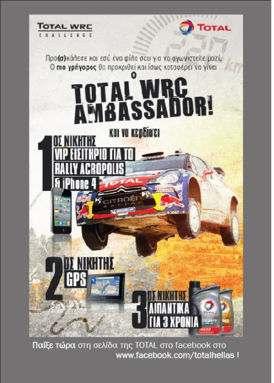 Ο πιο γρήγορος οδηγός θα γίνει ο πρώτος Έλληνας WRC Ambassador της Total στο Rally Acropolis που θα πραγματοποιηθεί στις 25 – 27 Μαΐου 2012. Θα παρακολουθήσει τον αγώνα ως VIP και θα μεταφέρει το δυναμισμό του αγώνα σε όλους τους fans της σελίδας τηςTotal στο facebook με το ολοκαίνουριο iPhone του! Ο δεύτερος πιο γρήγορος παίκτης του παιχνιδιού θα κερδίσει ένα GPS και ο τρίτος δωρεάν λιπαντικά για το όχημά του για 3 χρόνια.