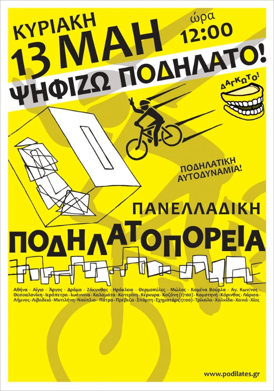 Ποδηλάτες και ποδηλάτισσες σε ολόκληρη την Ελλάδα ετοιμάζονται να πάρουν τους δρόμους την Κυριακή 13 Μαΐου, για πέμπτη συνεχόμενη χρονιά. Η 5η Πανελλαδική Ποδηλατοπορεία θα λάβει χώρα σε περισσότερες από 25 πόλεις, με το ραντεβού να έχει οριστεί για τις 12 το μεσημέρι. Σκοπός, όπως κάθε χρόνο, είναι να προβληθεί το ποδήλατο ως το πιο οικολογικό μέσο μετακίνησης, αλλά και να ευαισθητοποιηθούν οι αρμόδιοι φορείς, να περάσουν από τα παχιά λόγια σε συγκεκριμένες δράσεις και να δώσουν στο ποδήλατο το χώρο που του αξίζει στις ελληνικές μεγαλουπόλεις. Μερικά από τα αιτήματα των ποδηλατών είναι: