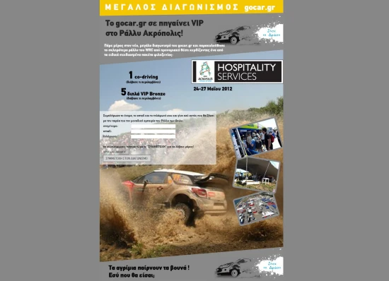 Με μεγάλη επιτυχία ολοκληρώθηκε ο διαγωνισμός που έκανε το gocar σε συνεργασία με τις υπηρεσίες φιλοξενίας του Ράλλυ Ακρόπολις. Οι 5 τυχεροί που κερδίζουν τα πέντε διπλά VIP Bronze πακέτα φιλοξενίας είναι: