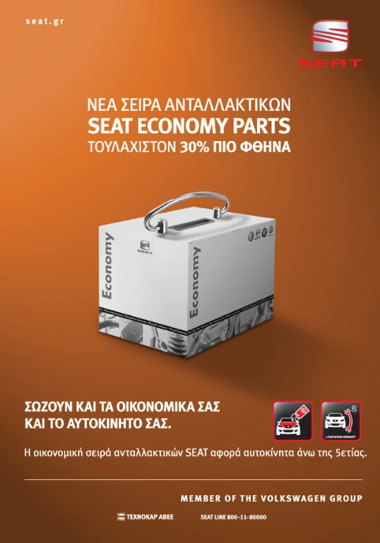 Η SEAT σας παρουσιάζει έτσι τη νέα, οικονομική σειρά ανταλλακτικών SEAT Economy Parts που είναι διαθέσιμη σε όλα τα εξουσιοδοτημένα συνεργεία SEAT. Η νέα αυτή οικονομική σειρά ανταλλακτικών είναι ειδικά σχεδιασμένη για αυτοκίνητα άνω της πενταετίας και συνδυάζει την εργοστασιακή ποιότητα και εγγύηση με τιμές 30% φθηνότερες από την κανονική σειρά.