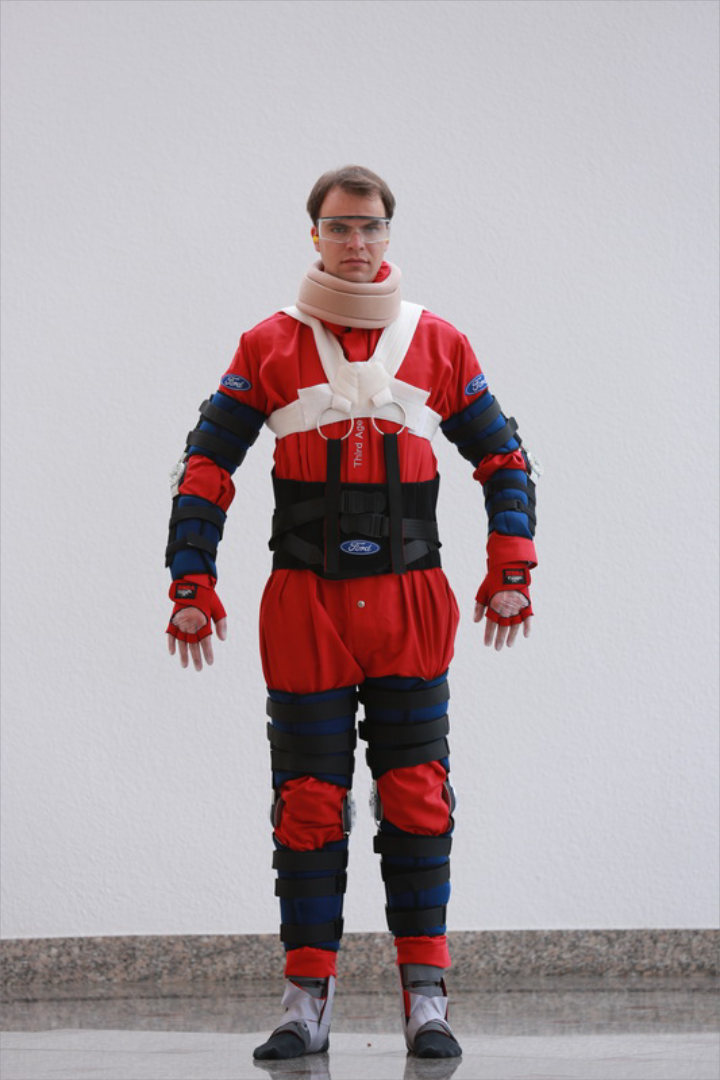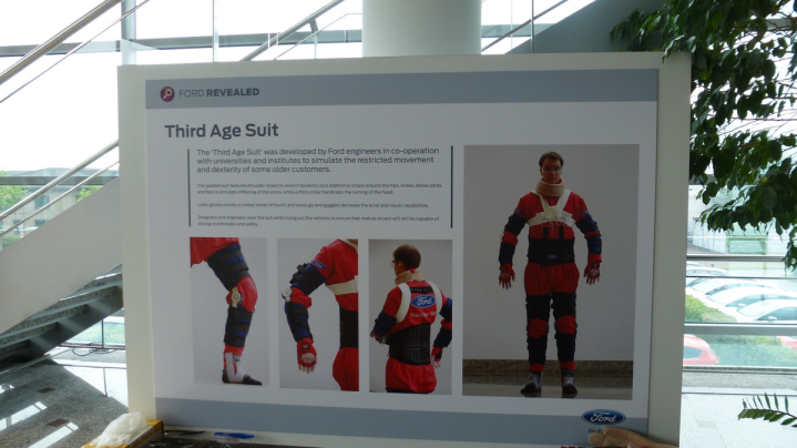 - Κοστούμι τρίτης ηλικίας: Παθήσεις στα μάτια, κινητικές δυσκολίες, μικρότερη ευελιξία είναι συμπτώματα που σίγουρα συναντάς σε ανθρώπους τρίτης ηλικίας. Με στόχο να γίνουν πιο εύκολα αντιληπτές οι προκλήσεις μετακίνησης που αντιμετωπίζουν οι άνθρωποι αυτής της ηλικίας, η Ford σε συνεργασία με πανεπιστήμια δημιούργησαν ένα κοστούμι που προσομοιάζει τα συγκεκριμένα συμπτώματα. Στο «κοστούμι τρίτης ηλικίας» ένας κορσές και ιμάντες ώμου περιορίζουν τις κινήσεις του πάνω μέρους του σώματος και την ευελιξία των γοφών. Άλλοι ιμάντες γύρω από το γόνατο, τον αγκώνα και τα πέλματα προσομοιώνουν άκαμπτες αρθρώσεις και ένα άκαμπτο κολάρο περιορίζει τις κινήσεις του κεφαλιού. Επιπλέον, γάντια Latex προσομοιώνουν τη μειωμένη αίσθηση αφής (πιθανόν λόγω διαβήτη) ενώ γάντια χωρίς δάχτυλα προσομοιώνουν μία μείωση στη χειρωνακτική δύναμη και την επιδεξιότητα. Ωτοασπίδες προσομοιώνουν την απώλεια ακοής, ενώ γυαλιά αναπαράγουν τις συνέπειες διαφόρων οφθαλμικών παθήσεων, όπως γλαύκωμα και καταρράκτης.