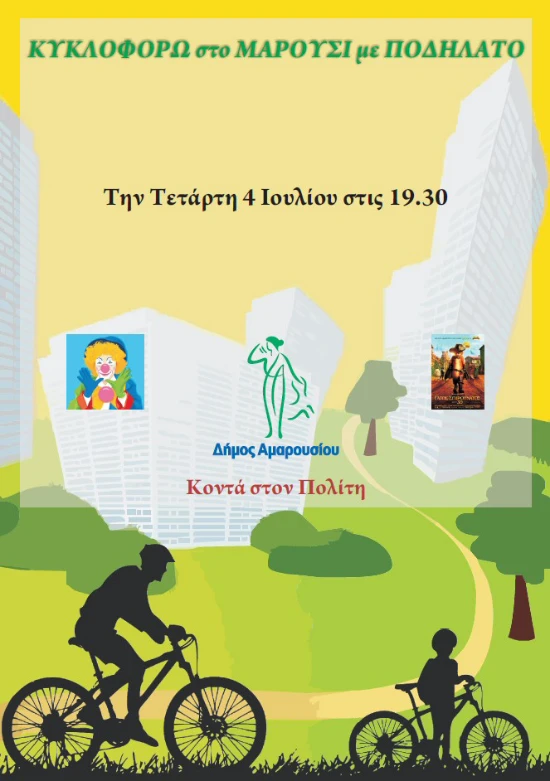 Σε ποδηλατοδρομία καλεί τα παιδιά με τους γονείς τους ο Δήμος Αμαρουσίου την Τετάρτη 4 Ιουλίου 2012. Η πράσινη διαδρομή με ποδήλατα, όπως χαρακτηρίζει την εκδήλωση ο Δήμος στην ανακοίνωσή του, θα γίνει στον ποδηλατόδρομο που ξεκινά από την Πλατεία Ξυλούρη (Μεσογείων & Αναπαύσεως) και καταλήγει στην Πλατεία Αργοναυτών (Μεσογείων & Αργοναυτών). Τους μικρούς ποδηλάτες θα υποδεχθούν το απόγευμα στις 19:30 στην Πλατεία Ξυλούρη, πριν από την έναρξη της πράσινης διαδρομής, κλόουν, ζογκλέρ και φουσκωτά, χαρίζοντάς τους άφθονο γέλιο και παιχνίδι. Με την ολοκλήρωση της διαδρομής και τον τερματισμό στην Πλατεία Αργοναυτών, μικροί και μεγάλοι θα απολαύσουν την προβολή της παιδικής ταινίας «Γάτος Σπιρουνάτος».