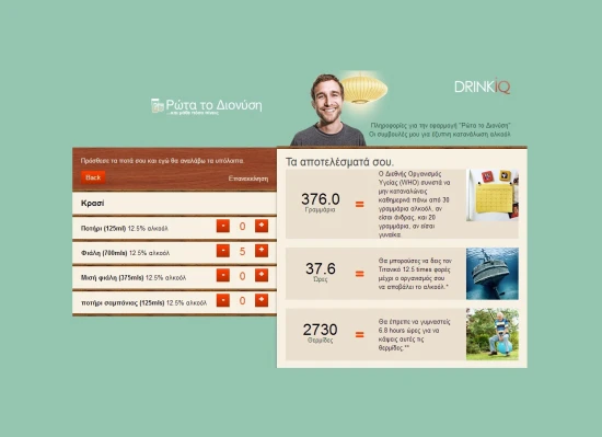 Ένα διαδικτυακό τόπο που ενημερώνει τους καταναλωτές σχετικά με τις επιλογές τους όταν πίνουν στο σπίτι ή με φίλους δημιούργησε η Diageo Hellas. Πρόκειται για την εφαρμογή “Ρώτα το Διονύση” (http://calculator.drinkiq.com). Ο “Διονύσης”, ο φίλος μας guru των ποτών, μας βοηθά να υπολογίσουμε τα γραμμάρια αλκοόλ που περιέχει το ποτό μας, όπως επίσης και τις θερμίδες που μας δίνει αλλά και το χρόνο που χρειάζεται ο οργανισμός μας για να το επεξεργαστεί. Το μόνο που χρειάζεται να κάνουν οι χρήστες του website είναι να επιλέξουν από μια λίστα ποτών τις προτιμήσεις τους και ο Διονύσης υπολογίζει και τους ενημερώνει. Το website επίσης περιλαμβάνει προτάσεις και συμβουλές υπεύθυνης κατανάλωσης.