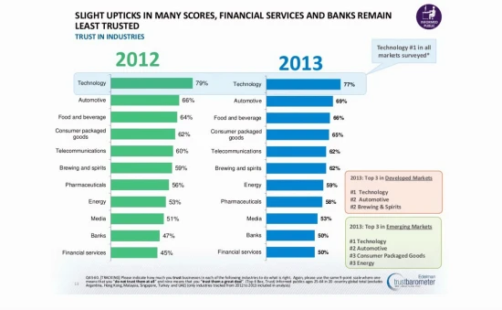 Δεύτερος κλάδος σε αξιοπιστία για το 2013 αναδείχτηκε η αυτοκινητοβιομηχανία, σε έρευνα-βαρόμετρο της εταιρείας δημοσίων σχέσεων Edelman, Edelman Trust Barometer 2013. Σύμφωνα με τα αποτελέσματα που παρουσιάστηκαν στο διεθνές οικονομικό forum στο Νταβός της Ελβετίας, η τεχνολογία έχει ποσοστό 77%, έναντι 69% για τον κλάδο του αυτοκινήτου και 66% για τον κλάδο της διατροφής. Αξιοσημείωτο πάντως είναι πως η αυτοκινητοβιομηχανία αύξησε το ποσοστό της σε σχέση με το 2012, έστω και κατά 3%. Η έρευνα πραγματοποιήθηκε μεταξύ Οκτωβρίου και Νοεμβρίου του 2012 και είχε δείγμα 31.000 κατοίκους από 26 χώρες.