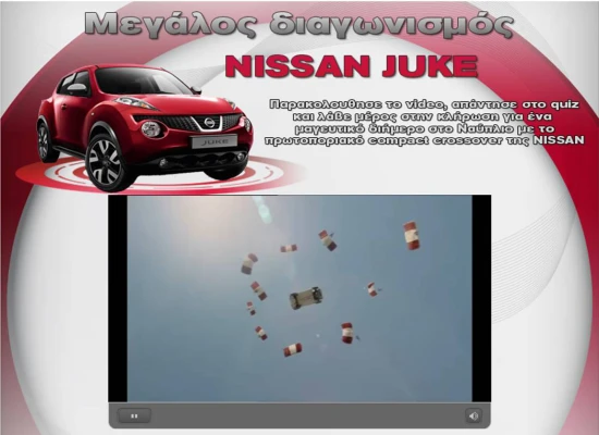 Η Nissan δίνει την ευκαιρία σε ένα τυχερό ζευγάρι να εκδράμει για ένα τριήμερο στο Ναύπλιο οδηγώντας ένα Juke. Απαραίτητη προϋπόθεση είναι να δεις κανείς το video και να απαντήσεις στο σχετικό quiz. Ο διαγωνισμός Like & Win έχει ήδη ξεκινήσει και θα διαρκέσει μέχρι τις 22 Απριλίου. Όσοι πιστοί των διαγωνισμών στο facebook επισκεφτείτε τη σελίδα της Nissan κάνοντας like.