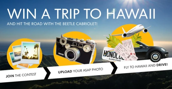 Όσοι έχετε εθιστεί στους διαγωνισμούς και θέλετε να διεκδικήσετε ένα έπαθλο πιο προχωρημένο τι θα λέγατε για ένα ταξίδι στη Χαβάη; Η Volkswagen σάς καλεί να αποθανατίσετε με τη φωτογραφική σας μηχανή το πνεύμα του «Όσο περισσότερος ήλιος γίνεται» να ανεβάσετε τη φωτογραφία στο site του ASAP και να διεκδικήσετε διακοπές δύο εβδομάδων στην πιο εξωτική πολιτεία των ΗΠΑ. Ο τυχερός-η θα κερδίσει δύο εισιτήρια μετ’ επιστροφής για τη Honolulu από την πλησιέστερη πόλη διαμονής, ένα Beetle Cabrio για 14 ημέρες με πληρωμένα όλα τα έξοδα διαμονής και μετακίνησης.