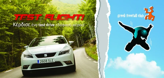 Η SEAT Τεχνοκάρ σε συνεργασία με το μεγαλύτερο κέντρο skydiving στην Ελλάδα, το Greek Freefall Club, διοργανώνει διαγωνισμό μέσω της σελίδας της SEAT Greece στο facebook για την ανάδειξη ενός νικητή, ο οποίος θα κερδίσει ένα αξέχαστο test drive εδάφους-αέρος! Πιο συγκεκριμένα, ο μεγάλος νικητής που θα αναδειχθεί μετά από κλήρωση, θα κερδίσει ένα test drive με το νέο SEAT Leon για ένα Σαββατοκύριακο, το οποίο και θα τον ταξιδέψει μέχρι τις εγκαταστάσεις του GFFC στην Κωπαϊδα, όπου θα έχει την ευκαιρία να γνωρίσει, σε συνθήκες απόλυτης ασφάλειας, την αξέχαστη εμπειρία της ελεύθερης πτώσης, πραγματοποιώντας ένα άλμα  tandem από ύψος 14.000 ποδιών.