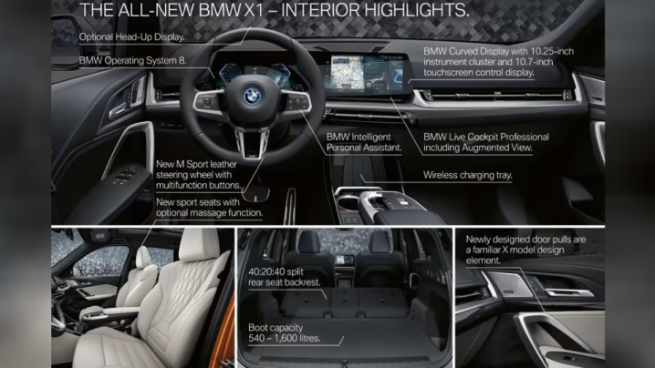 Στο εσωτερικό βρίσκουμε μία μικρότερο μορφή του τελευταίας γενιάς iDrive 8 με την διπλή κυρτή οθόνη, 10,25 ιντσών για τον πίνακα οργάνων και 10,7 ιντσών για την κεντρική οθόνη αφής. Κάτι που απουσιάζει, όπως είδαμε να γίνεται και με την νέα Σειρά 2 Active Tourer είναι ο χαρακτηριστικός περιστροφικός διακόπτης από την αιωρούμενη πλέον, κεντρική κονσόλα. Εκεί πλέον βρίσκουμε τους διακόπτες επιλογής σχέση για το “shift-by-wire” κιβώτιο και την επιφάνεια ασύρματης φόρτισης για smartphones. Από πλευράς χώρων γενικότερα, η νέα X1 θα φτάνει τα 540 lt σε χώρο αποσκευών με την δεύτερη σειρά καθισμάτων στην θέση τους και τα 1.600 lt όταν αυτά διπλωθούν.