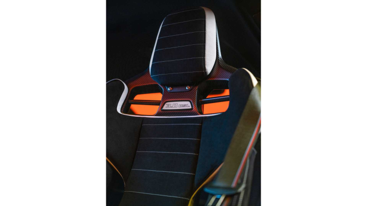 Τα carbon μπάκετ καθίσματα εμπρός, τα ανθρακονήματα σε πάνελ θυρών και ταμπλό, το τιμόνι με επένδυση Alcantara, η απουσία πίσω καθισμάτων και η αντικατάστασή τους με ειδικές θήκες για την αποθήκευση δύο κρανών και η αφαίρεση των κλασικών ηχομονωτικών υλικών, δίνουν το στίγμα της κατασκευής και συνάμα προσφέρουν τη δυνατότητα στον οδηγό να εισπράξει την ανάλογη ηχητική εμπειρία.