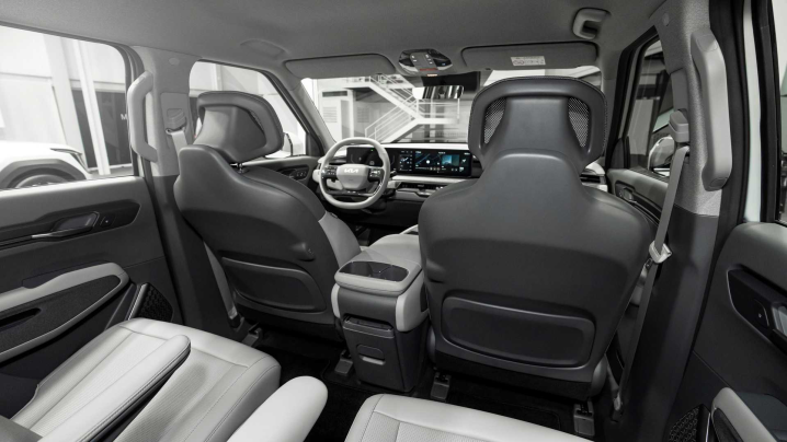 Χάρη στην πλατφόρμα E-GMP της Kia και το μακρύ μεταξόνιο, το ηλεκτρικό SUV προσφέρει άπλετους χώρους. Η καμπίνα είναι εξόχως λειτουργική και πρακτική, με τις τρεις σειρές καθισμάτων να παρέχουν ανέσεις σε στυλ lounge. Το EV9 θα είναι διαθέσιμο σε 6θέσια και 7θέσια διάταξη, με τους επιβάτες της πρώτης και δεύτερης σειράς να έχουν τη δυνατότητα να ξαπλώσουν στα καθίσματα κατά τη φόρτιση του οχήματος. Μάλιστα, οι θέσεις της 2ης σειράς περιστρέφονται κατά 180 μοίρες, προκειμένου οι πίσω επιβάτες να αλληλεπιδρούν μεταξύ τους.