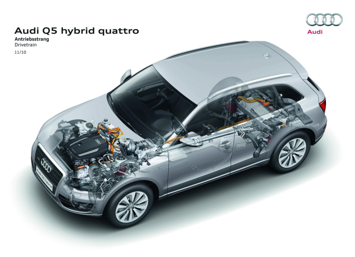 Τα επίσημα στοιχεία για το Q5 Hybrid (βλέπε προηγούμενες αναφορές εδώ και εδώ) αποκάλυψε η Audi στη Γενεύη. Το υβριδικό Q5 θα μπει στην παραγωγή στα τέλη του 2011 και είναι το πρώτο υβριδικό μαζικής παραγωγής της μάρκας με δύο συστήματα κίνησης. Το υβριδικό του σύστημα απαρτίζεται από τον 2λιτρο TFSI βενζινοκινητήρα των 211 PS και έναν ηλεκτροκινητήρα. Η συνολική ισχύς του συστήματος είναι 245 ίπποι και η ροπή 480 Nm, η μέση κατανάλωση μόλις 6,9 lt/100 km και οι εκπομπές CO2 159 g/km. Το Q5 Hybrid μπορεί να κινηθεί αποκλειστικά με τον ηλεκτροκινητήρα για 3 km και με ταχύτητα 60 km/h, ενώ η “ηλεκτρική” τελική του φτάνει τα 100 km/h. Η ηλεκτρική ενέργεια αποθηκεύεται σε μπαταρία ιόντων λιθίου. Όταν στο παιχνίδι μπαίνει και ο TFSI, η τελική ανεβαίνει στα 222 km/h και τα πρώτα 100 km/h από στάση έρχονται σε 7,1 sec. Η ισχύς φτάνει και στους 4 τροχούς μέσω του συστήματος μόνιμης τετρακίνησης quattro και ενός αυτόματου κιβωτίου 8 σχέσεων.