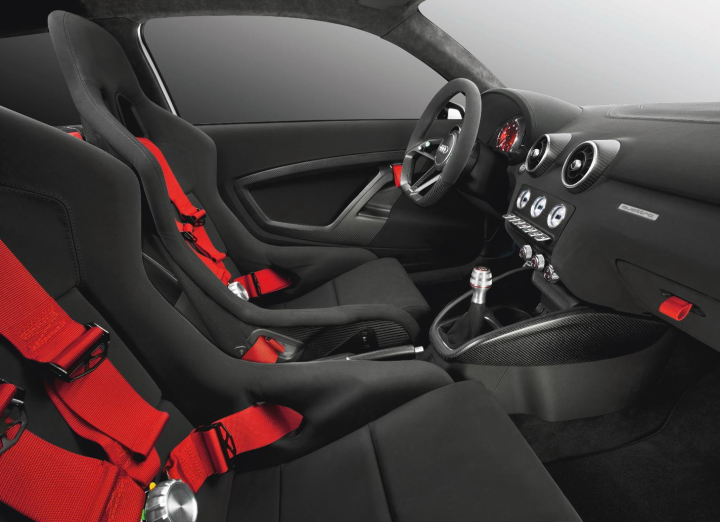 Στο εντυπωσιακό αμάξωμα ξεχωρίζουν η “φτερούγα” πίσω στην οροφή που θυμίζει το VW Polo WRC, οι τεράστιοι αεραγωγοί, ο πίσω διαχύτης και οι ζάντες 19’’ με τη σχεδίαση τουρμπίνας, πίσω από τις οποίες κρύβονται 6-πίστονες δαγκάνες και κεραμικά δισκόφρενα. Η χρήση ανθρακονημάτων CFRP σε τμήματα του αμαξώματος συγκρατεί το βάρος στα 1.390 κιλά. Στην καμπίνα έχουν τοποθετηθεί μπάκετ από R8 GT, ενώ το πίσω κάθισμα πήρε φύλλο πορείας για το ράφι, αφήνοντας χώρο για μπάρες ενίσχυσης του πλαισίου, αλλά και δύο αγωνιστικά κράνη. Οι κόκκινες ζώνες 4 σημείων ολοκληρώνουν την έντονα σπορ χροιά του εσωτερικού.