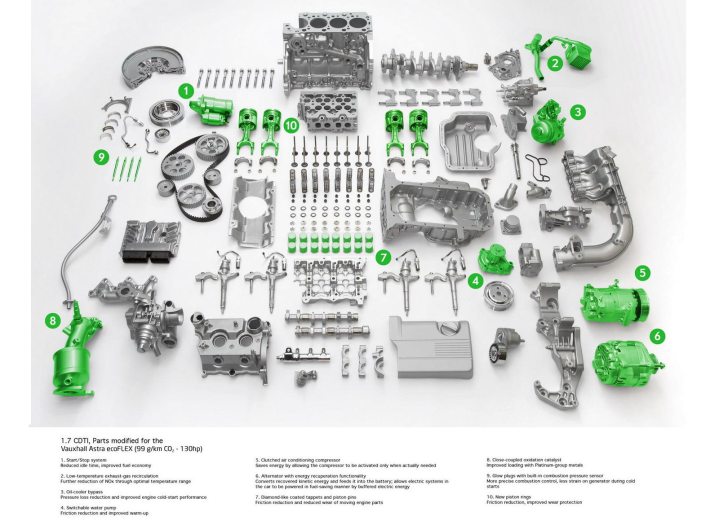 Το νέο Astra ecoFLEX με τον 1.7 CDTI turbo-diesel παρουσίασε η Opel, πλαισιώνοντας το Insignia ecoFLEX (160 hp) και το Corsa ecoFLEX (95 hp) στη green γκάμα της. Το νέο πεντάθυρο Astra ecoFLEX καταναλώνει κατά μέσο όρο 3,7 lt diesel/100 km, έχει εκπομπές CO2μόλις 99 g/km και θεωρείται το οικονομικότερο και καθαρότερο Astra όλων των εποχών. Αυτό δεν σημαίνει πως οι επιδόσεις έχουν περάσει σε δεύτερη μοίρα, αφού ο 1.7 CDTI αποδίδει ισχύ 130 PS, ροπή 300 Nm (διαθέσιμη από τις 2.000 μέχρι τις 2.500 rpm) και συνεργάζεται με εξατάχυτο μηχανικό κιβώτιο. Το πακέτο τεχνολογιών που εξασφαλίζουν χαμηλή κατανάλωση και μειωμένες εκπομπές CO2 στο Astra 1.7 CDTI ecoFLEX περιλαμβάνει τα εξής: