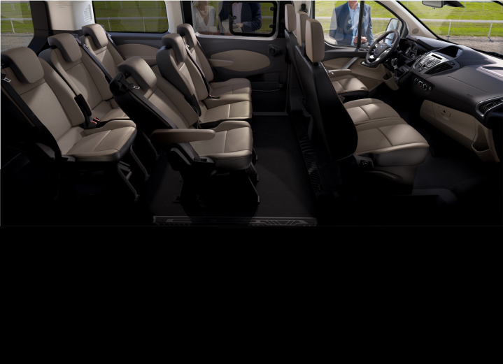 Ειδικά στο Tourneo Custom, τα καθίσματα στις δύο πίσω σειρές έχουν πολλές δυνατότητες ρύθμισης, ενώ μπορούν να αφαιρεθούν όταν δεν χρειάζονται. Συνολικά υπάρχουν πάνω από 30 συνδυασμοί για άριστη προσαρμογή ανάλογα με την περίπτωση. Σημειώστε πως όλα τα καθίσματα εφοδιάζονται με ζώνες ασφαλείας 3 σημείων, ενώ υπάρχουν και βάσεις Isofix για παιδικά καθίσματα. Όπως διαπίστωσα στην πράξη, οι πίσω επιβάτες απολαμβάνουν ευρυχωρία και άνεση σε μία ποιοτική και πλήρως επενδυμένη καμπίνα. Διατίθεται μάλιστα μία γκάμα κομψών, ανθεκτικών υλικών για τα καθίσματα που περιλαμβάνει πλήρως δερμάτινη ταπετσαρία σε ελκυστική απόχρωση ανοιχτόχρωμης πέτρας, η οποία δημιουργεί την αίσθηση πιο ευρύχωρου και φωτεινού περιβάλλοντος. Προαιρετικά, διατίθενται ενσωματωμένα σκιάδια για τα πλαϊνά παράθυρα.