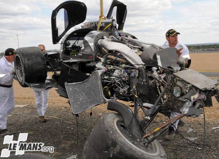 Την ανάσα των θεατών στον αγώνα έκοψε το σοβαρό ατύχημα του Allan McNish στην πρώτη ώρα, το Audi του οποίου ήρθε σε επαφή με την Ferrari του Anthony Beltoise (κατηγορία GTE Pro) και βγήκε εκτός πίστας. Το R18 TDI των περσινών νικητών έφερε τούμπες και σταμάτησε στον προστατευτικό τοίχο από ελαστικά, σχεδόν διαλυμένο, με κομμάτια του να πετάγονται προς φωτογράφους και θεατές. Ευτυχώς κανένας δεν τραυματίστηκε (από καθαρή τύχη όπως μπορείτε να δείτε στο παρακάτω video), συμπεριλαμβανομένου και του McNish που μέχρι εκείνη τη στιγμή προηγούνταν στον αγώνα. Το δεύτερο από τα τρία Audi είχε επίσης σοβαρό ατύχημα: εγκατέλλειψε την 8η ώρα όταν ο Mike Rockenfeller βγήκε εκτός δρόμου κατά την διάρκεια προσπέρασης της Ferrari (GTE Pro) του Robert Kaufmann.