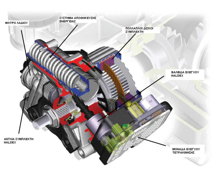 Ο συμπλέκτης Haldex εδράζεται εμπρός από το πίσω διαφορικό, με βασικό σκοπό την εμπλοκή του πίσω άξονα όταν υπάρχει απώλεια πρόσφυσης από τους μπροστινούς τροχούς. Ο Haldex αποτελείται από μια υδραυλική αντλία πίεσης λαδιού, που διαθέτει ένα δακτυλιοειδές έμβολο από τη μια μεριά πλευρά κι ένα κινούμενο έμβολο από την άλλη. Μέσα στο κέλυφος κι ανάμεσα στα δύο αυτά μέρη βρίσκεται ένας πολύδισκος συμπλέκτης. Υπό κανονικές συνθήκες όπου οι δύο άξονες εμπρός και πίσω περιστρέφονται με την ίδια ταχύτητα η αντλία δε λειτουργεί και η ροπή μεταφέρεται κατά βάση στον εμπρός άξονα.