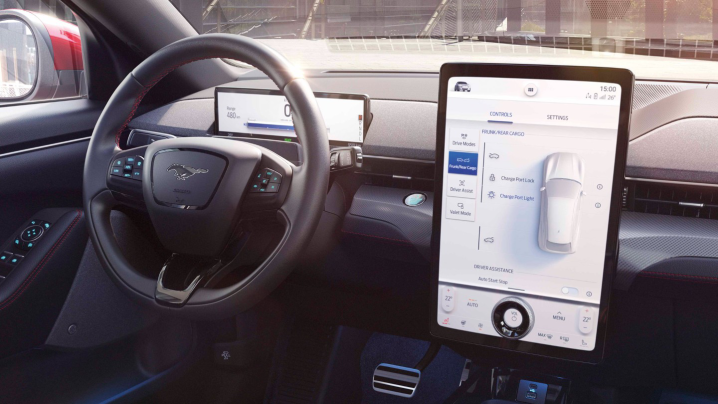 Η νέα Ford Mustang Mach-E είναι από μόνη της ένα εντυπωσιακό αυτοκίνητο. Όμως, στο εσωτερικό ξεχωρίζει η πολύ μεγάλη, κατακόρυφα τοποθετημένη οθόνη αφής 15,5". Αποτελεί το κέντρο ελέγχου όλων των συστημάτων του αυτοκινήτου, το μέγεθός της όμως δεν προβληματίζει αφού υπάρχει ξεχωριστός χώρος για τα πολυμέσα, τον κλιματισμό, τις λειτουργίες του οχήματος και το τηλέφωνο ταυτόχρονα. Highlight, το περιστροφικό χειριστήριο που… επιπλέει: δεν τη διαπερνά, αλλά είναι κολλημένο πάνω της και η πίσω πλευρά του απλώς αγγίζει το γυαλί, όπως θα έκανε και ένα δάχτυλο!