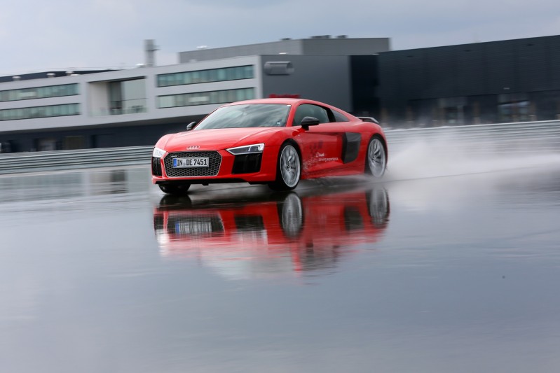 Η ουσία κρύβεται στην μηχανολογική συγκρότηση που αποτελεί το ζητούμενο κάθε petrol head που σέβεται τον εαυτό του. Ξεκινήσαμε την πρώτη γνωριμία με δοκιμασίες σε βρεγμένο τερέν, σλάλομ και αποφυγή εμποδίου για μια πρώτη εξοικείωση και κατόπιν εντός πίστας για μερικούς γύρους. Και είναι σημαντικό να ξεκινάς μια οδηγική γνωριμία από το ολισθηρό τερέν καθώς με άλλα supercars είναι συνηθέστερο να τα κλειδώνεις με τις πρώτες σταγόνες της βροχής. Βέβαια στο ειδικό skid στο Neuburg η πρόσφυση ακόμη και σε βρεγμένο είναι πολύ πολύ ανώτερη από αυτή που θα δει ο τυχερός όταν προλάβει φρέσκο ασφαλτοτάπητα πριν σκονιστεί και γυαλίσει από τον ήλιο. Κερασάκι στην τούρτα δύο hot laps με τους εκπαιδευτές Rob Kunst και Markus Gruber που φανέρωσαν όλα τα κρυμμένα μυστικά του R8 και άφησαν ένα χαμόγελο στα πρόσωπα όλων όσων κάθισαν στο δεξί κάθισμα.