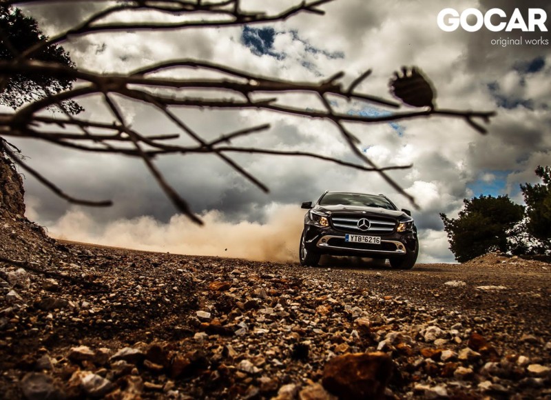 Από την άλλη, πέρα από στιλ, φινέτσα, φρου φρου και αρώματα, η ψηλοκάπουλη αισθητική, τα μαύρα διακριτικά πλαστικά προστατευτικά στα φρύδια των θόλων αλλά και στα μασπιέ, οι ποδιές σε εκτέλεση βουρτσισμένου αλουμινίου εμπρός και πίσω και η εμφάνιση υπερυψωμένου hatchback σε πείθει ότι δεν θα αρνηθεί την στιγμή που θα κληθεί να ανακατευτεί με τα χώματα. Η διακριτική στολή περιπέτειας δεν προσβάλει την γενικότερη αισθητική που είναι κομμένη και ραμμένη στα Mercedes πρότυπα. Πολυτέλεια και ποιότητα πάνω από όλα, στοιχεία που προκύπτουν και όταν ανοίξουν οι πόρτες της μικρομεσαίας καμπίνας. Χώροι ανάλογοι της premium κατηγορίας που απευθύνεται με τους τέσσερις επιβάτες να νιώθουν άνετα και μόνο όταν φιλοξενείται πέμπτος, η πίσω τριάδα να νιώθει τα συμπτώματα της μικρομεσαίας καμπίνας, ενώ σε αυτή την περίπτωση ο μεσαίος έχει να αντιμετωπίσει και το πληθωρικό τούνελ της μετάδοσης. Πίσω από τους επιβάτες τα 421 lt του χώρου αποσκευών εξασφαλίζουν τις μεταφορικές τους ανάγκες, ενώ στα πλαίσια της πρακτικότητας προσφέρονται προαιρετικά(πακέτο Load Compartment) άλλα 60, με την πλάτη να ρυθμίζεται 15 μοίρες πιο όρθια. Με την πλήρη αναδίπλωση φυσικά τα διαθέσιμα λίτρα πολλαπλασιάζονται(1.235) και ο επίπεδος χώρος φόρτωσης περιορίζεται μόνο από το στενό άνοιγμα της πίσω πόρτας. Πέρα από λύσεις, εργονομία και ευρυχωρία η GLA προσφέρει και αναμενόμενη τεχνολογία με την πρώτη επαφή να είναι εμφανής στον διαθέσιμο εξοπλισμό που ενδεικτικά περιλαμβάνει πλήρες πακέτο ασφάλειας(9 αερόσακοι), τελευταίας γενιάς Pre-Safe και φυσικά εφαρμογές ενημέρωσης και ψυχαγωγίας μέσω της οθόνης τύπου tablet που ξεχωρίζει στην κορυφή της κονσόλας. Τα στάδια εξοπλισμού συμπληρώνουν προαιρετικά το ήδη υψηλό επίπεδο, ενώ τα περιθώρια εξατομίκευσης είναι σχεδόν ατελείωτα τόσο σε επίπεδο αισθητικής όσο και σε ηλεκτρονικά βοηθήματα, ειδικά πακέτα, στοιχεία άνεσης, πολυτέλειας και αξεσουάρ.