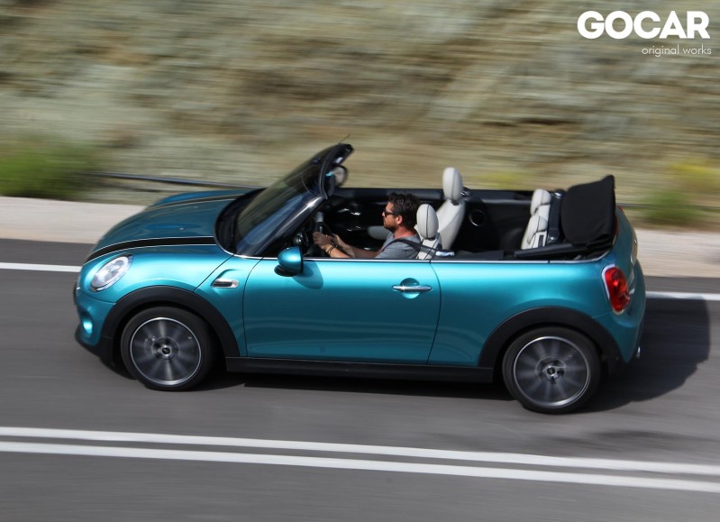 Επι της ουσίας αυτός που το επιλεγεί θα το οδηγεί συχνά πυκνά ανοιχτό και θα απολαμβάνει τις βόλτες του με σωστή προστασία από τον αέρα με τους στροβιλισμούς να εμφανίζονται κυρίως πίσω και όσο ανεβαίνει η ταχύτητα. Πρακτικά η ακαμψία δεν επηρεάζεται και το MINI Cabrio μπορεί να θυμίζει σε συμπεριφορά τα κλειστά αδέρφια του. Εμφανώς βαρύτερο μεν αλλά ομοίως επικοινωνιακό και ευχάριστο θα σε επιβραβεύσει με την απολαυστική συμπεριφορά του που χαρακτηρίζεται από ευχάριστη ευελιξία και ζωντάνια, που περνά σαν αίσθηση στον οδηγό. Εξαιρετικό σε ζύγισμα, νιώθεις ανά πάσα στιγμή που πατούν οι τροχοί σου και ποιες οι προθέσεις τους και κρατάς ένα παραδοσιακά επικοινωνιακό τιμόνι που δεν θα σε ξαφνιάσει με τις ακαριαίες αντιδράσεις, ούτε θα σου λείψει η πληροφόρηση. Η καρτίσια συμπεριφορά παντρεύεται με την άνεση που χρειαζόταν για να ολοκληρωθεί σαν αυτοκίνητο και τώρα δεν είναι αναγκαίο να οδηγείς με την ταυτότητα στο στόμα για να απολαύσεις οδήγηση. Η σπορ συμπεριφορά παραμένει τατουάζ στο πετσί του και η δραστήρια ουρά διατηρεί τον ρόλο της αν αναζητάς πλασαρίσματα με τα ηλεκτρονικά απενεργοποιημένα. Αν κάτι σε χαλάει με κατεβασμένη την κουκούλα είναι η ορατότητα πίσω που ουσιαστικά ακυρώνει τον κεντρικό καθρέφτη, ενώ με ανεβασμένη πάλι προβληματίζει κυρίως από τα φαρδιά τμήματά της. Τουλάχιστον κλειστό, ταξιδεύει σαν να μην υπάρχει υφασμάτινη οροφή, δείγμα της προσοχής του κατασκευαστή στην λεπτομέρεια. Με τον υπερτροφοδοτούμενο τρικύλινδρο των 1.5 λίτρων να ταιριάζει γάντι για την λογική του αυτοκίνητου, το MINI Cabrio δεν προβληματίζεται στο θέμα της απόδοσης. Αποδίδει 136 ίππους στις 4.500 rpm και 230 Nm ροπή μόλις από τις 1.250 rpm, κάτι που σημαίνει ότι σχεδόν από το ρελαντί αφήνει τον αζύγιστο ήχο του τρικύλινδρου και το Cooper είναι γεμάτο, ζωηρό και ευδιάθετο να εκδηλώσει επιταχύνσεις. Η καλή περιοχή είναι οι χαμηλομεσαίες, χωρίς να σημαίνει ότι αρνείται την υπερστροφία, όμως ψηλά δεν θα σε αφήσει με το στόμα ορθάνοιχτο. Οι επιδόσεις είναι καλές για τα δεδομένα των απλωμένων σχέσεων στο 6άρι κιβώτιο, με τα 0-100 km/h να έρχονται σε 8,8’’ και την τελική ταχύτητα να αγγίζει τα 208 km/h. Με βάση την χαμηλόροπη λογική του θα περίμενε κανείς και εντυπωσιακή κατανάλωση όμως το Cooper δυσκολεύεται να επιβεβαιώσει τα 4,9 lt/100 km που ανακοινώνει ο κατασκευαστής. Συνηθέστερες καταναλώσεις τριγυρίζουν συν-πλην τα 9 lt/100 km ενώ σε πολύ οικονομικό τέμπο θα δεις λίγο παραπάνω από τα 7 λίτρα.