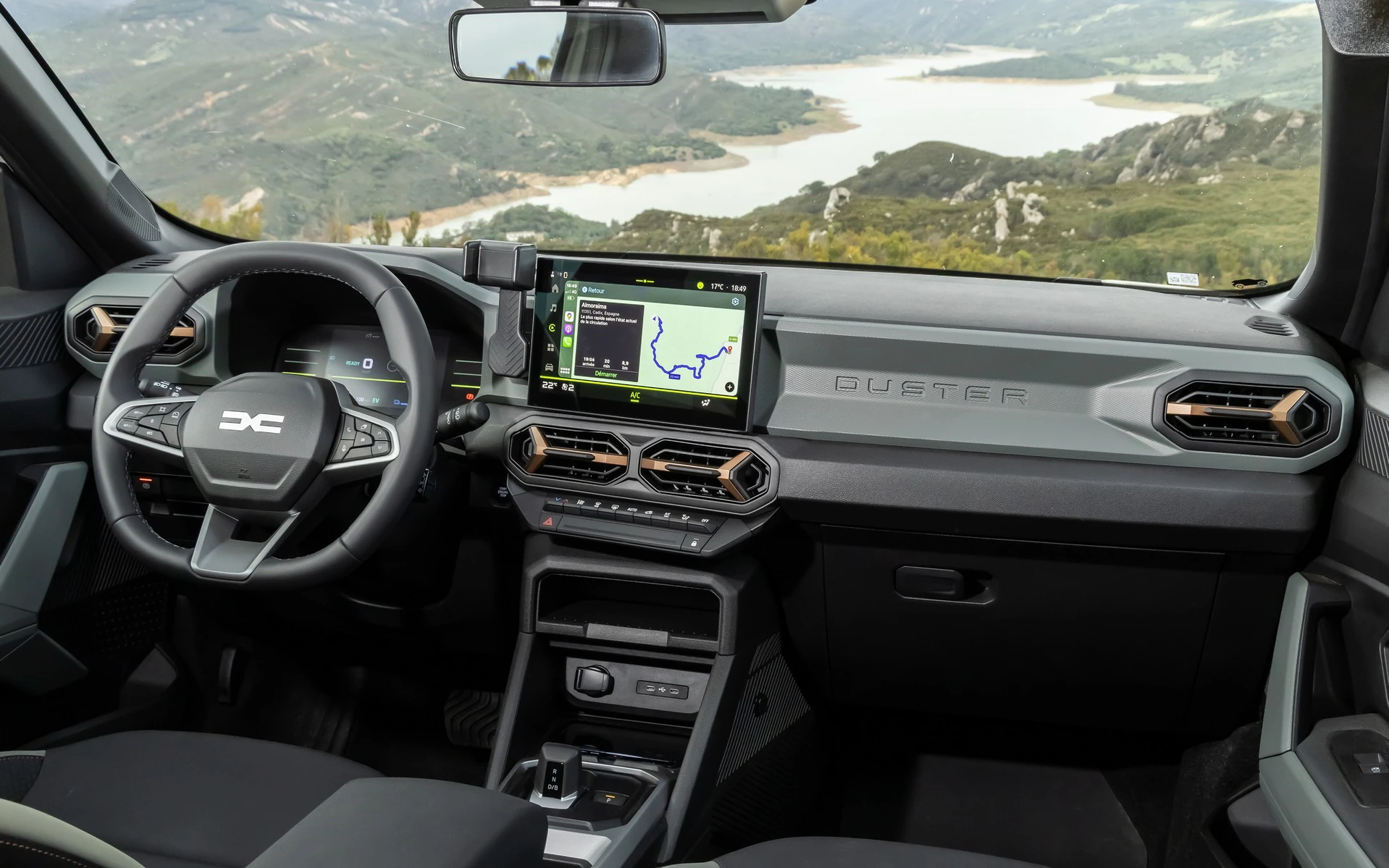 Στο εσωτερικό του, το νέο Dacia Duster «παίζει» πάρα πολύ έξυπνα. Η σχεδίαση των επιφανειών αντανακλούν τη φιλοσοφία του αυτοκινήτου, ακριβώς όπως και στο εξωτερικό του, με το ξαπλωμένο “Y” να το συναντάμε σε πολλά σημεία. Οι επιφάνειες αποτελούνται αποκλειστικά και μόνο από σκληρά πλαστικά, ωστόσο έχει γίνει τόσο καλή δουλειά με την αύρα που αποπνέει η καμπίνα, που δεν κάνουν αρνητική εντύπωση. Αντίθετα, ταιριάζουν γάντι με αυτό που δηλώνει το Duster και γίνονται μέρος της προσωπικότητάς του. Στοιχείο που σε κάνει να στραβοκοιτάς κάποια πλαστικά μέτριας ποιότητας που εντοπίζονται σε χαμηλότερα σημεία. Η μεγάλη διαφορά, εκτός της αισθητικής, έρχεται και σε ψηφιακό επίπεδο. Η μεγάλη οθόνη του infotainment των 10,1 ιντσών δεν έχει την παραμικρή σχέση με το μέτριο και απολύτως βασικών δυνατοτήτων συστήματος πολυμέσων που είχε το προηγούμενο μοντέλο. Το Media Nav Live έχει πολύ ωραίο μενού, γρήγορη λειτουργία και όμορφα γραφικά. Υποστηρίζει ασύρματη σύνδεση με Apple CarPlay και Android Auto και διαθέτει πλειάδα πληροφόρησης, όπως και παραμετροποίησης ανάλογα με τις προτιμήσεις.