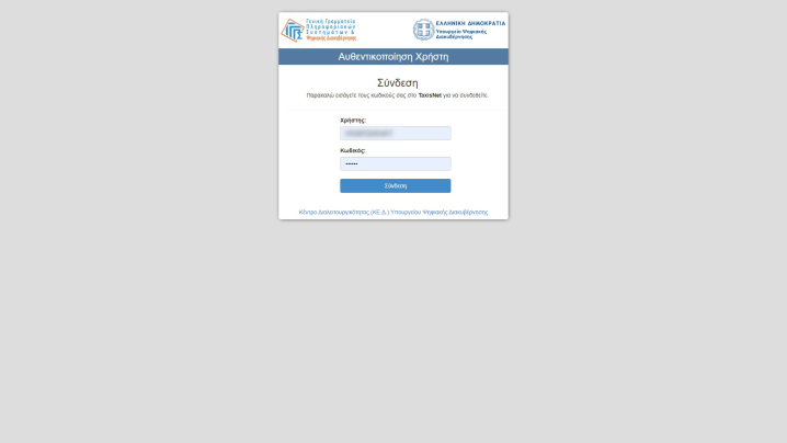 Στη συνέχεια θα ανοίξει η κλασική σελίδα της Γενικής Γραμματείας Πληροφοριακών Συστημάτων που δίνουμε τους κωδικούς Taxis ώστε να συνδεθούμε στον λογαριασμό μας. Πατάμε «Σύνδεση», επιλέγουμε τον κύκλο που γράφει «Συνέχεια» και πατάμε «Αποστολή».