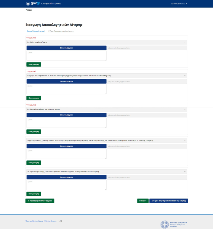 Αυτό θα μας οδηγήσει σε μία σελίδα όπου θα πρέπει να εισάγουμε όλα τα σχετικά δικαιολογητικά του Κινούμαι Ηλεκτρικά 3. Απόδειξη αγοράς οχήματος, έγγραφο που να βεβαιώνει τον IBAN (σε αυτόν το λογαριασμό θα μπουν τα χρήματα που θα πάρουμε από το Κινούμαι Ηλεκτρικά 3) και όλα τα υπόλοιπα έγγραφα που ζητάει.